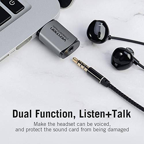 Deze USB externe geluidskaart heeft een 3,5 mm aux TRRRS-poort (geïntegreerde audio-in en audio-out-interface), waarmee u uw bestaande headset met 3,5 mm TRRS op uw pc kunt aansluiten via een USB-interface. Opmerking: de oortelefoon moet microfoon ondersteunen als we spraakoproep willen.