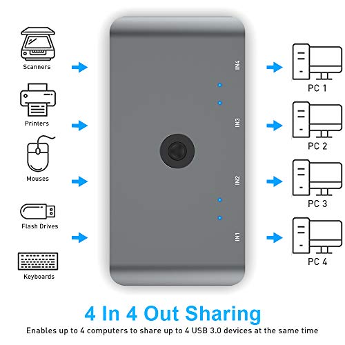 USB-schakelaar 4 computers voor het delen van apparaten zoals printer, toetsenbord, muis, printer en USB-harde schijf met maximaal 4 computers. Nodig voor aparte werkplekken met USB 3.0 Switch. USB-sharing-switch zorgt ervoor dat uw apparaten altijd klaar zijn voor gebruik met één druk op de knop.Sluit monitoren en randapparatuur aan op de USB 3.0-hubswitch. De 4-poorts USB-hub ondersteunt USB 3.0-snelheden tot 5 Gbps, zet HD-video’s en foto’s in seconden over .