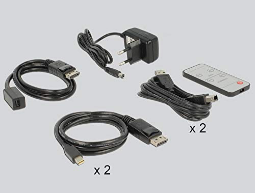 Omvang levering: 2 x kabel USB A stekker naar USB B stekker, lengte ca. 1 m, 2 x kabel DP-stekker naar Mini DP-stekker, lengte ca. 0,9 m, 2 x kabel DP-stekker naar Mini DP-bus, lengte ca. 0,9 m, externe voeding, afstandsbediening