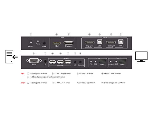 2 schakelknoppen met led-indicatoren voor bron (PC1, PC2) en doel (DisplayPort, HDMI), omschakeling door knop of via infrarood afstandsbediening