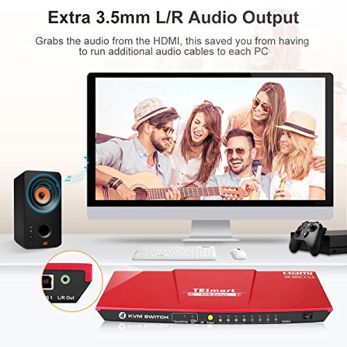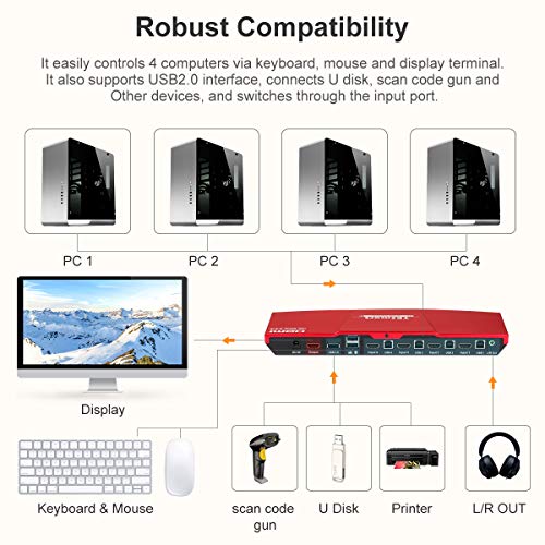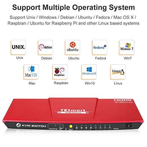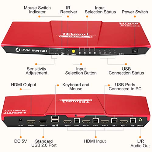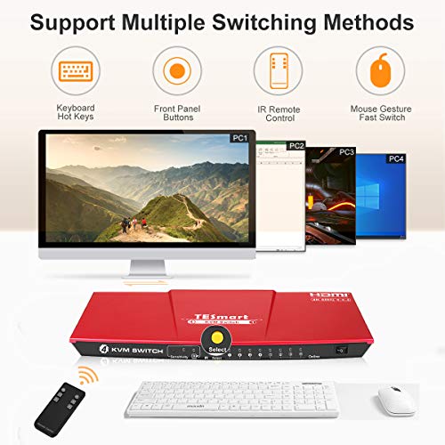 Specification: TESmart 4K Ultra HD 4×1 3840×2160 @ 60Hz 4: 4: 4 HDMI KVM-switch met 2 1,5 m KVM-kabels die USB 2.0-apparaatbediening…