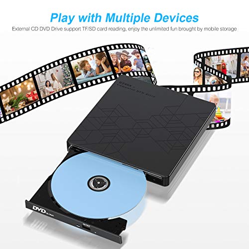 【5-in-1 externe dvd-cd-drive】 De externe cd-branderlezer is compatibel met USB 2.0 en USB 1.0. De cd-brander heeft 2 USB-poorten, 1 micro-USB-poort, 1 SD-slot, 1 TF-sleuf. U kunt tegelijkertijd 2 USB-poorten en micro-USB-poort gebruiken, evenals TF-kaartlezer of SD-kaartlezer. Dit externe cd-dvd-station is klein maar krachtig. (Opmerking: SD-poort en TF-sleuf mogen niet tegelijkertijd worden gebruikt. Micro USB-poort is alleen bedoeld voor het opladen)